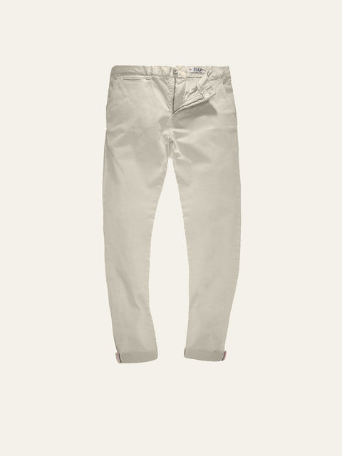 Pantalon chino, poches italiennes, poche ticket, boutons 4 trous milieu devant, poches passepoilées au dos. Galon tricolore cousu le long de la couture intérieure. Etiquette tissée cousue sur la fesse gauche. La coupe est fuselée, près du corps. Le look vintage et authentique est apporté par la technique de teinture en pièce qui donne relief à la matière, aux marquages, aux coutures.