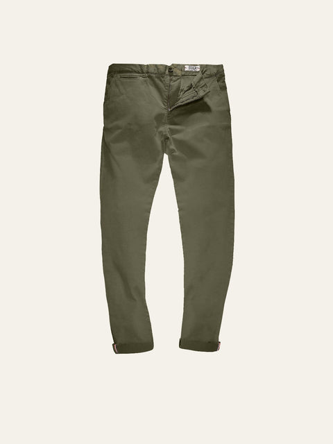 Pantalon chino, poches italiennes, poche ticket, boutons 4 trous milieu devant, poches passepoilées au dos. Galon tricolore cousu le long de la couture intérieure. Etiquette tissée cousue sur la fesse gauche. La coupe est fuselée, près du corps. Le look vintage et authentique est apporté par la technique de teinture en pièce qui donne relief à la matière, aux marquages, aux coutures.